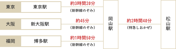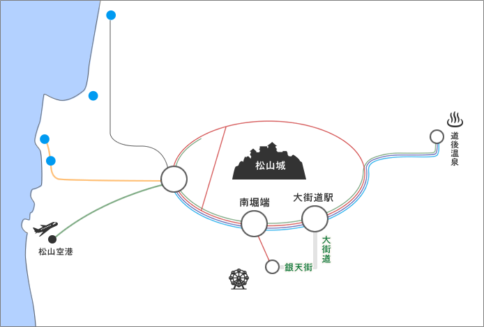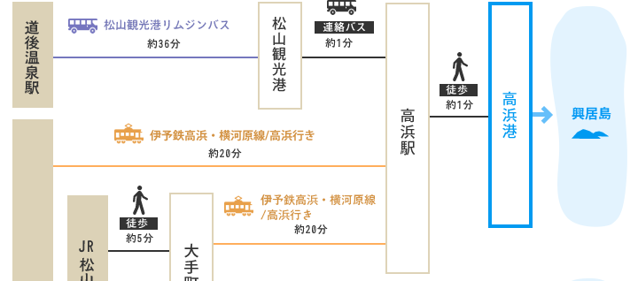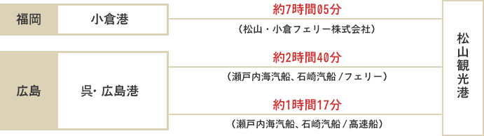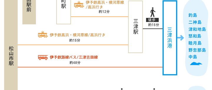 三津浜港 ― 高浜港または松山観光港 ― 睦月港(睦月島)― 野忽那港(野忽那島)― 大浦港(中島)