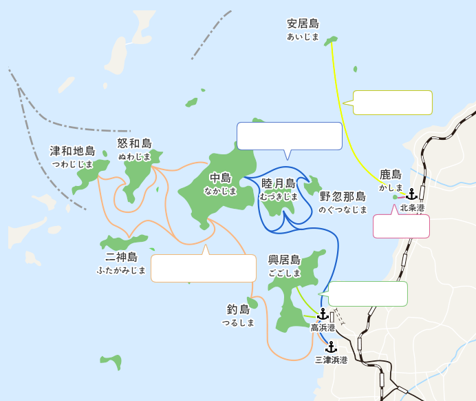 高浜港―神浦港(中島)―上怒和港(怒和島)―元怒和港(怒和島)―津和地港(津和地島)―二神港(二神島)―神浦港(中島)―高浜港