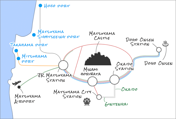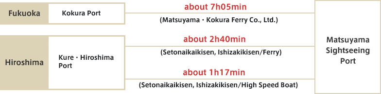 Mitsuhama port --- Takahama port --- Tsurushima port (Tsurushima Island) --- Kamiura port (Nakajima Island) --- Futagami port (Futagamijima Island) --- Tsuwaji port (Tsuwajijima Island) --- Motonuwa port (Nuwajima Island) --- Kaminuwa port (Nuwajima Island) --- Nishinaka port (Nakajima Island)