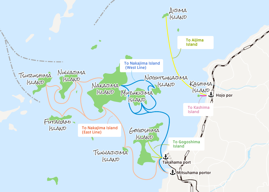 Mitsuhama port --- Takahama port --- Muzuki port (Muzukijima Island) --- Nogutsuna port (Nogutsunajima Island) --- Oura port (Nakajima Island)