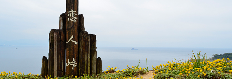 Beside the tree that says “Koibito Toge”, a bench is placed for lovers to cuddle close together and see the beautiful view. The blue sea and yellow Gazania flowers in full bloom will envelop visitors in the spring. This stunning location is also used in films. When a Japanese actor named Ohura Ryuichi once filmed in Koibito Toge with his son, they left a stone with a commemorative drawing. This special stone has been displayed in Koibito Toge ever since.