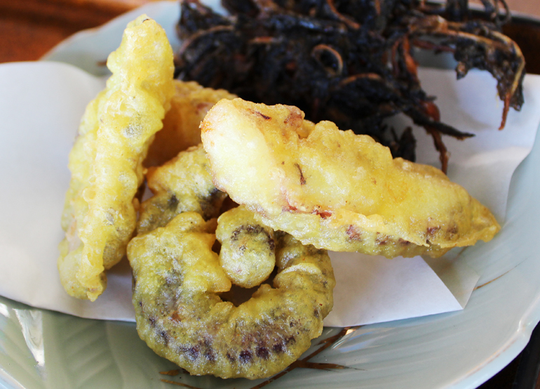 名物のひじき天ぷらと季節の海鮮料理(タコの天ぷら、タコ刺し、サザエの刺身など)をご賞味下さい。