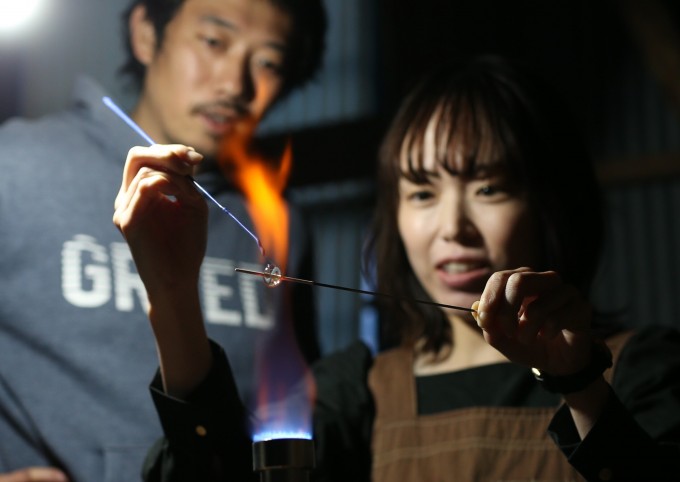 バーナーの炎でガラスを溶かしてとんぼ玉を作ります。その後、完成したとんぼ玉をアクセサリーに加工していただきます。職人と一緒に作るので初めての方も安心してお越しください。詳細は叉紋堂FaceBookページでご確認ください。https://www.facebook.com/SAMONDO55/