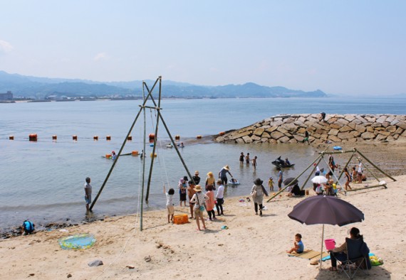 松山市北条の西方海上に浮かぶ鹿島は、細かい白砂のビーチが400m続く海水浴場があり、また防波堤では釣りもできます。遠浅で、夏場にはサメ除けネットを張るため安心して泳げ、夏場は海水浴客で賑わいます。