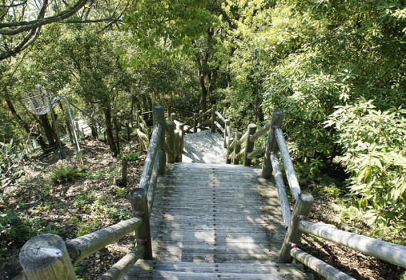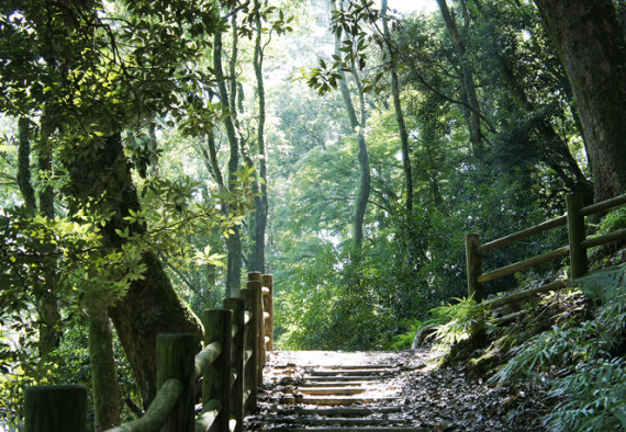松山市北条の西方海上に浮かぶ鹿島の標高113.8mへの遊歩道は、美しい森林地帯で「えひめ森林浴88ヶ所」の59番に指定されています。クロマツ・クスノキ・カカツガユ・ネズミサシなど、暖地性常緑照葉樹が繁茂し約260種の植物が生育。登山道には本ルートのほか、夕渚の道・風早の道・小鹿の道・波妻の道があり登山(道が悪いところもあるので注意)と森林浴を楽しめます。