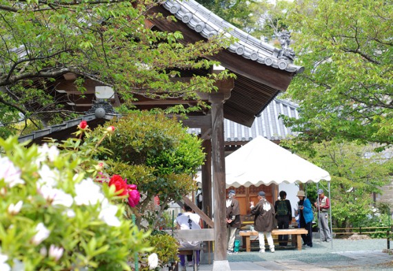毎年4月20日・21日の2日間開催される「興居島・島四国」は、島外からも多くの参拝客が訪れます。島をあげて開催前に草刈りや遍路道の整備を行い、当日はお茶や果物などお遍路さんへのお接待が島の至る所で行われ、あたたかいおもてなしが島全体を包みこみます。由良港近くの観音寺を1番札所として出発し、船越や泊方面の沿岸沿いを巡り、八十八番札所を1番札所の観音寺近くで迎えるという、ほぼ島を1週する約30㎞の工程です。