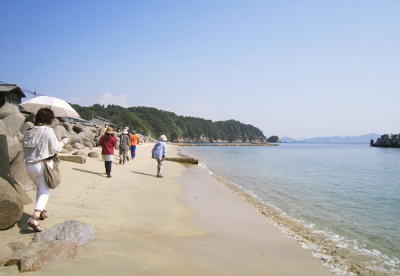 瀬戸内海の西部の中心近くにあり、港に寄り集まるように集落、東海岸には「長屋門」と呼ばれる立派な門構えの家が並び、かつて島で栄えた行商の面影が濃く残っています。島の東西にある2つの山を”8の字”に回る「睦月のスカイライン」からの眺めは絶景であり、西には約9kmの島四国八十八ヶ所、東には約7kmの西国三十三ヶ寺があり、多くの方がミニ巡礼の島歩きに訪れます。樹齢300年を超える「夫婦楠」や歩いて渡ることができる梅の子島など、見どころが多くあります。