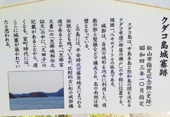 頂上の地形を巧みに利用した城郭は、南側の絶壁は自然の城壁となり、まるで島全体が城塞であったかのようです。おそらく南北朝時代に比定され、本山城・泰山城に後続するものと考えられていますが、築城年代や築城者は不明です。クダコ水道の要衝にありましたが、1585年の忽那水軍の滅亡とともに水軍的機能も終わりを告げたようです。その後、江戸時代には草刈り・採藻の入会地となりました。