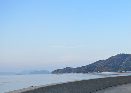 ここまでくると、対岸に大きな島、津和地島がみえます。そして海岸沿いに自転車を走らせて行くと2つの山の形に特徴のある二神島が遠くに見えてきます。手前の2つが双子島。それにしても、こんなに近くに見えるのはココからしかありません。