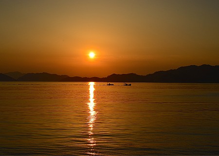 怒和島で夕日を見るために西海岸に陣取りました。遠くの夕日が静かに沈んで行く時、帰路につく2隻の漁船が静かに帰路につきます。