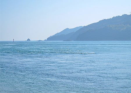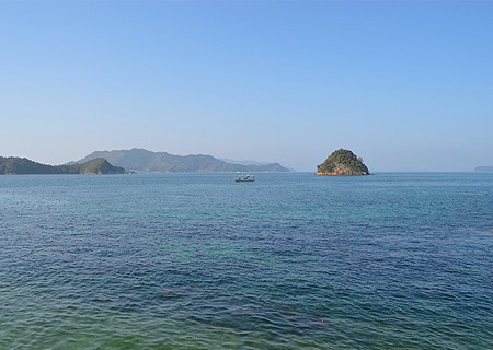 更に進んでいくと、小さな島がみえます。竹ノ子島です。その向こうに見えるのは、山口周防の大島町で700mしか離れていません。この島に渡ると柳井まで橋が繋がっているので中国地方に渡れてしまうんですね。