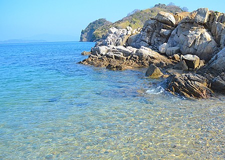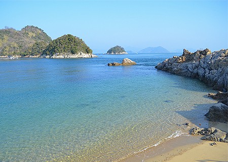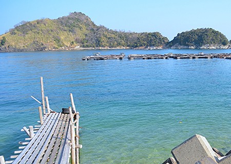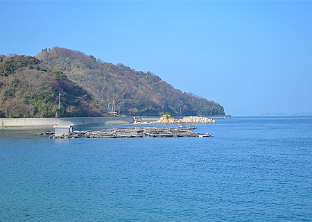 自転車でゆっくり巡っていくと。綺麗な岩場の向うに小さな島が見えてきて、その島の前には養殖筏がありました。これは、ヒラメの養殖だそうです。この付近の海岸線はとても綺麗な海と島風景が見ものです。