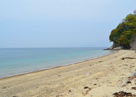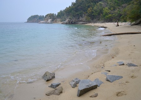 港も道から一歩逸れると急に狭い道になってきます。そこをひたすら進んでいくと山道になってしまい、島なのを忘れてしまいそうですが、両側から潮の音が聞こえるので島の頂上を歩いているのがわかります。途中、右の浜に降りてみました。生州浜です