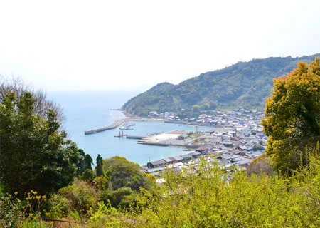 下船して左方面に向かい緩やかな上り坂を進んでいくと、先ほどの港が見えてきます。遠くに興居島の小富士が見えます。