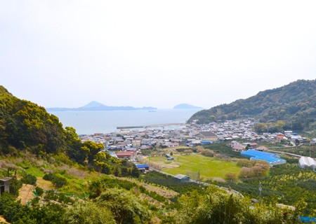 島内を1周回りきるころ、対岸に北条の町並みと眼下には睦月港が見えてきます。さらに道沿いに進んで行くと遠く興居島の小富士の稜線が綺麗な曲線を描いているのがわかります。
