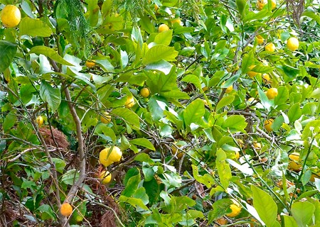 レモンの木の側を通りながら対岸に中島本島を見る