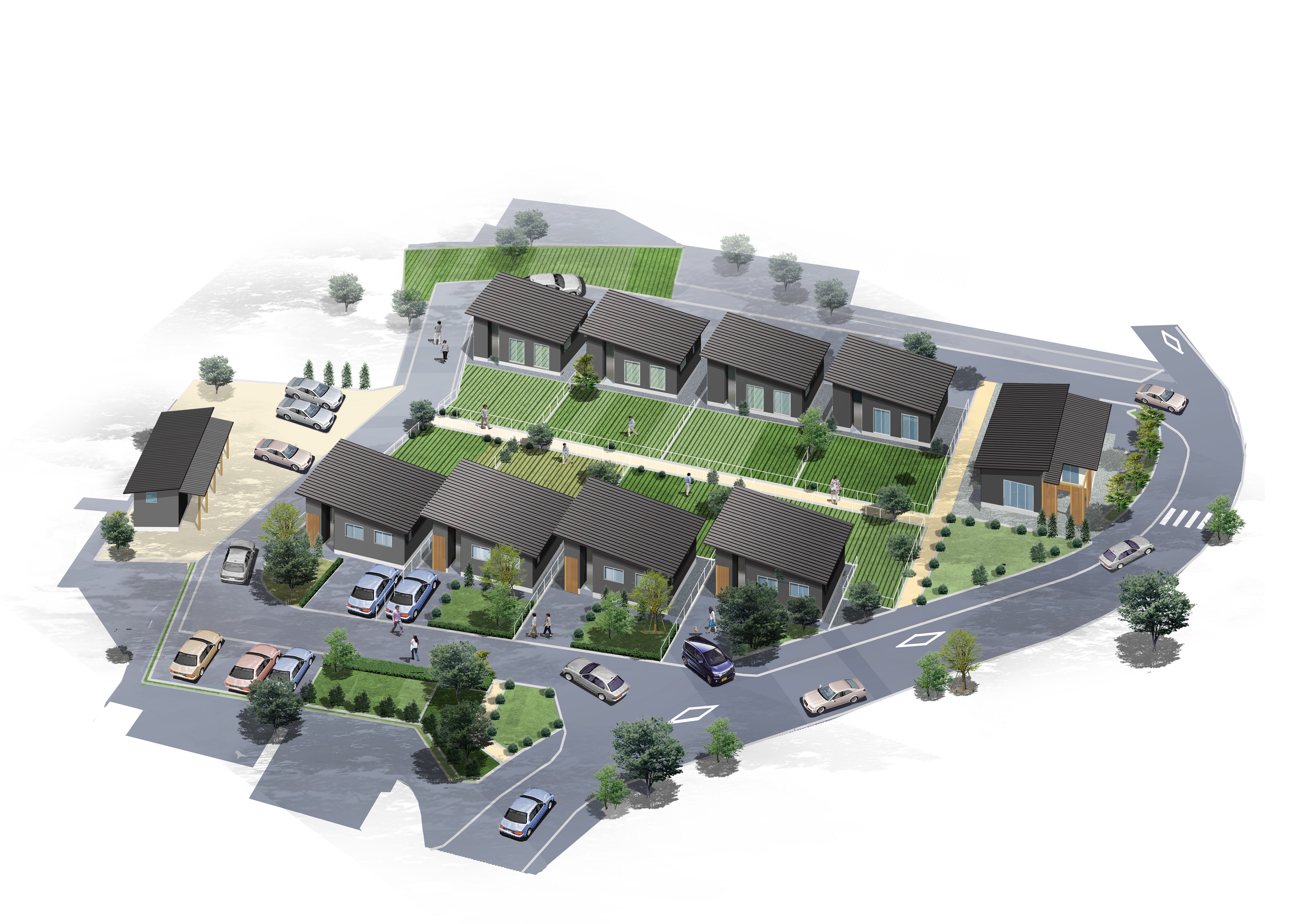 1LDK×8戸 全ての区画に約100平方メートルの農園と1台分の駐車場付き!