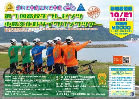 2023年09月15日 お知らせ Tweet 「第7回 高校生プレゼンツ中島文化財サイクリングツアー」を開催します 秋の忽那諸島、中島を思いっきり堪能できる、高校生プレゼンツのサイクリングツアーです。 詳しくはこちらをご覧ください。 第7回高校生プレゼンツ中島文化財サイクリングツアー